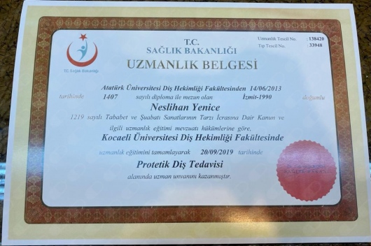 2013 yılında Kocaeli Üniversitesi Diş Hekimliği fakültesinde Protetik Diş Tedavisi alanında uzmanlık eğitimine başlamış ve başarıyla tamamlamıştır.